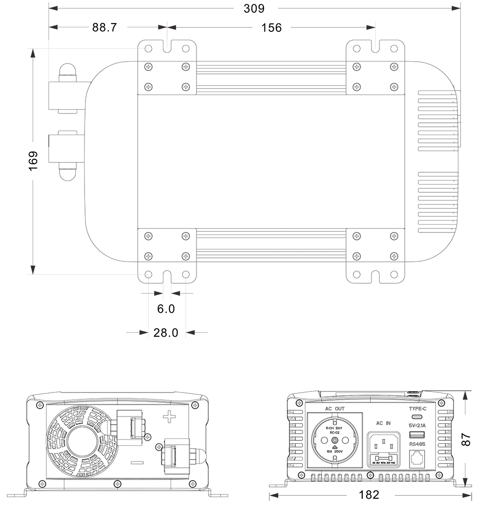 Mekaaniset piirustukset: (309x182x87 mm)