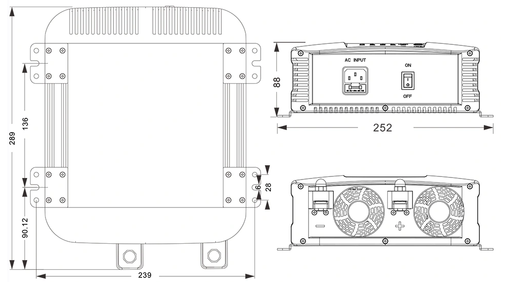 Mekaaniset piirustukset: (289 × 252 × 88 mm)