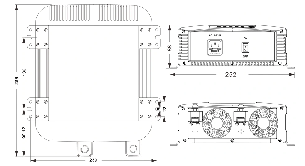 Mekaaniset piirustukset: (289 × 252 × 88 mm)