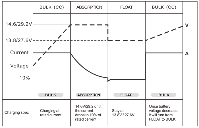 Akun ohjaus (3-vaiheiset akkulaturit) Bulkki / Absorptio / Kelluvuus