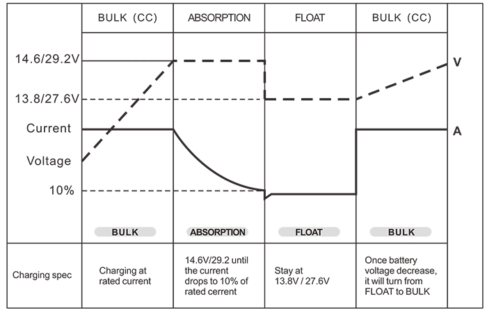Akun ohjaus (3-vaiheiset akkulaturit) Bulkki / Absorptio / Kelluvuus