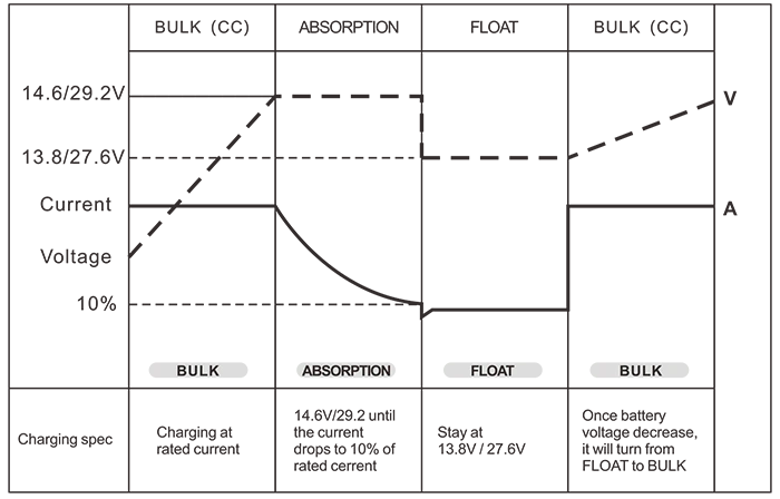 Akun ohjaus (3-vaiheiset akkulaturit) Bulkki / Absorptio / Kelluvuus